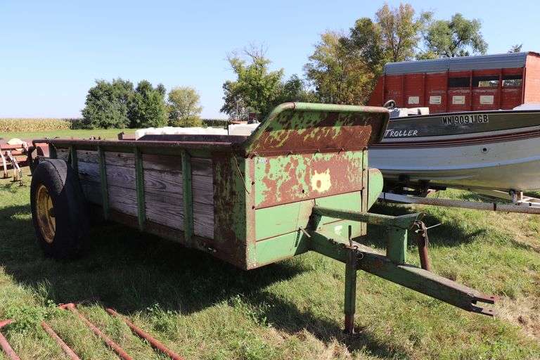 LOT 123 - JOHN DEERE MANURE SPREADER, NEEDS REPAIR, SINGLE AXEL, APRON CHIAN