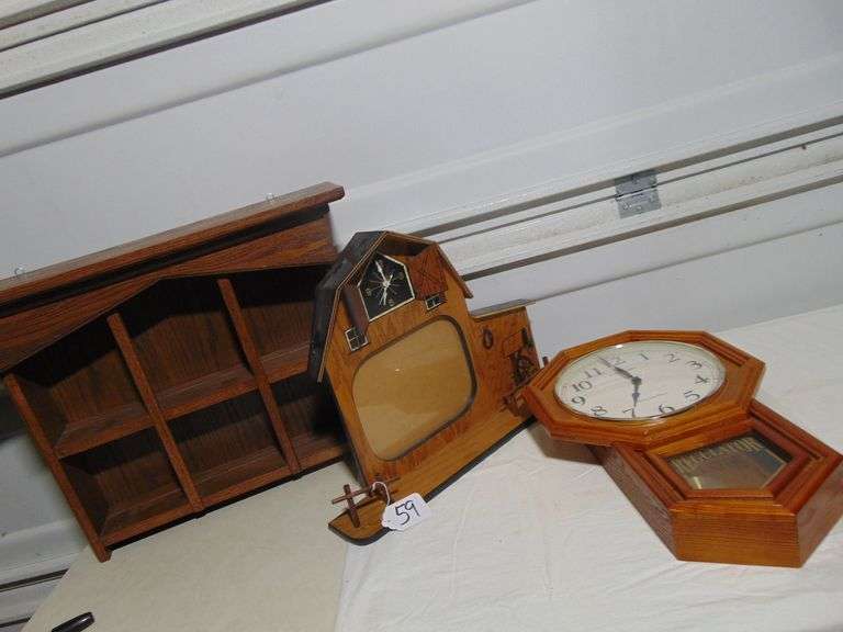 LOT 59 - WALL CLOCK, BARN FRAME, WALL SHELF