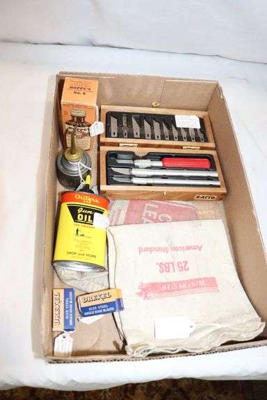 LOT 320 - VINTAGE OIL CANS, XACTO KNIFE, BLADES