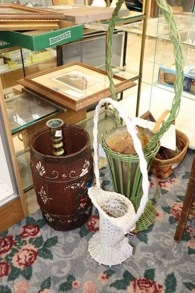 LOT 239 - PAINTED NAIL KEG, BRASS CANDLE HOLDERS
