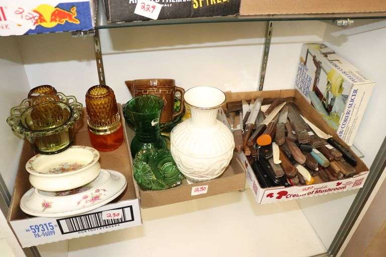 LOT 230 - BABY DISHES, VASES, KNIVES, APPLE PEELER
