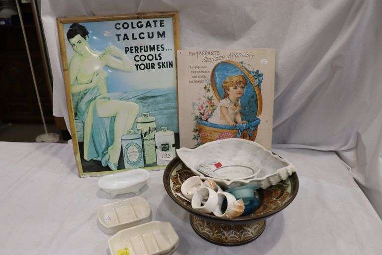 LOT 193 - 2 TIN SIGNS BOWL, SOAP DISHES