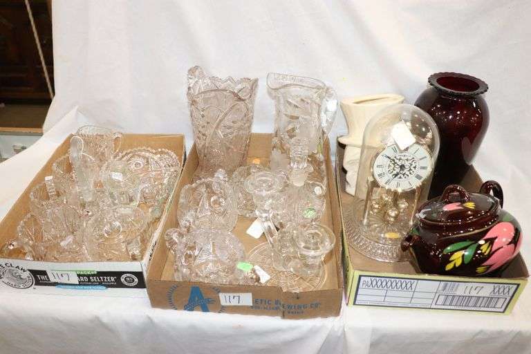 LOT 117 - CLEAR CUT GLASS, TEA POT, ANNIVERSARY CLOCK, VASE
