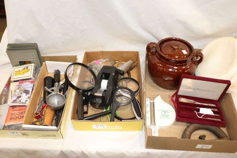 LOT 89 - HAT, BEAN POT, ICE CREAM SCOOP, BOOKENDS, OFFICE ITEMS, BUTTER KNIVES