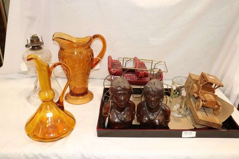 LOT 73 - WOOD CARVED BUSTS, BUGGIE, AMBER PITCHERS, OIL LAMP