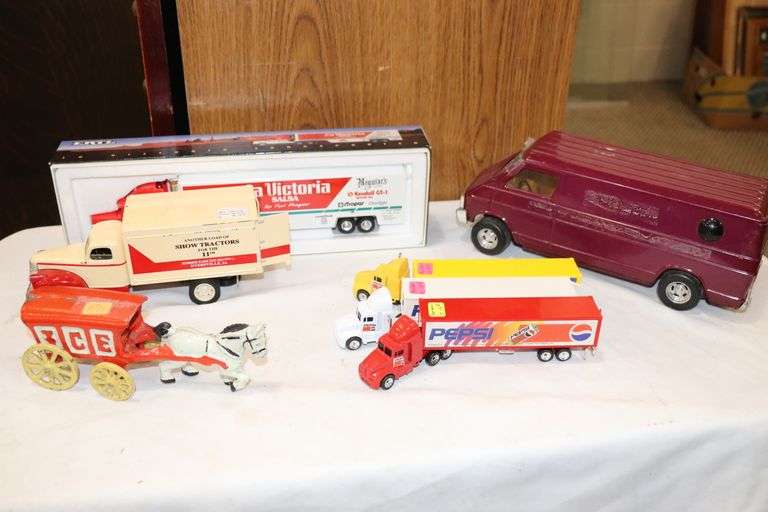 LOT 28 - ASSORTED TRUCKS, CAST ITRON HORSE & BUGGY ICE WAGON