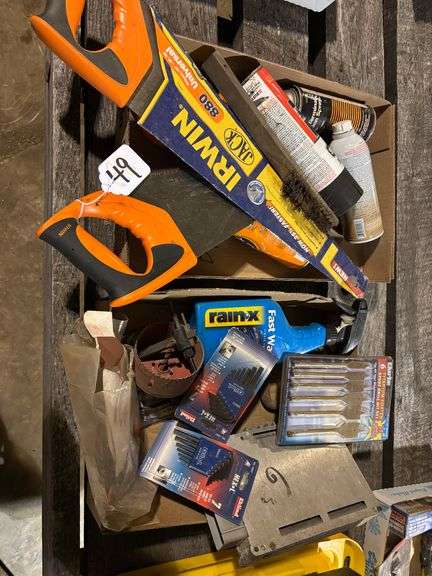 LOT 49 - 2 BOXES BRAND NEW IRWIN SAWS, SPADE BITS, ALLEN WRENCHES